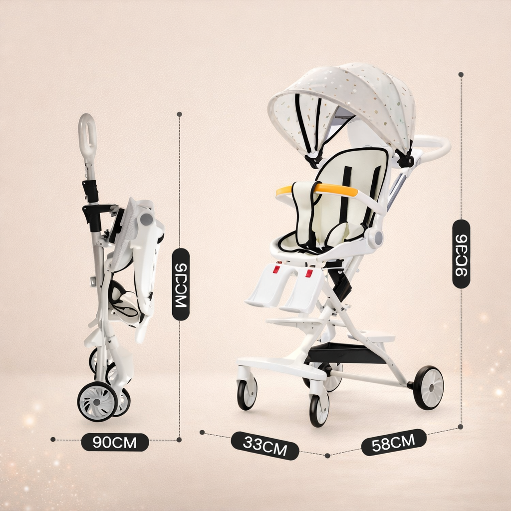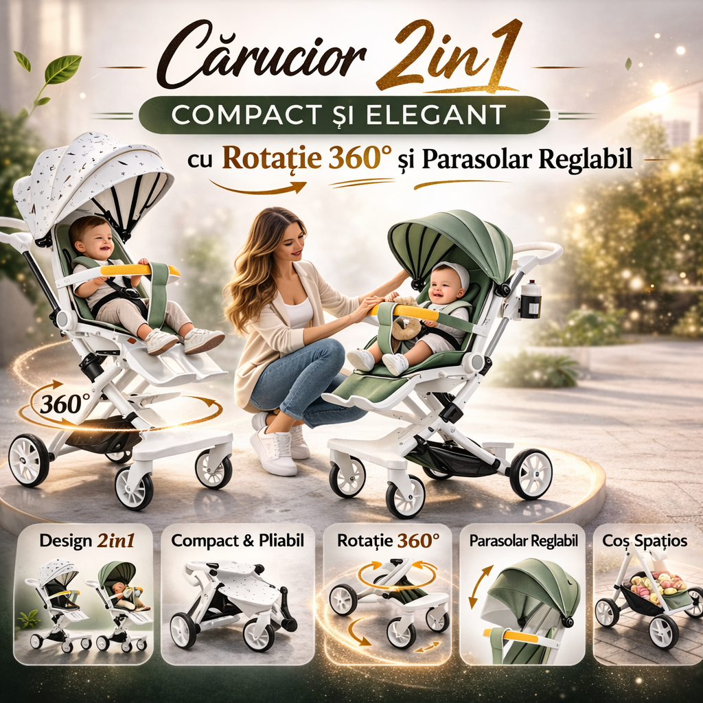 Cărucior 2in1 Compact și Elegant cu Rotație 360° și Parasolar Reglabil